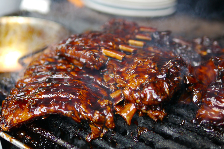 Leg het RVS rooster er op en rook de spare ribs ca. 2,5 uur op 100 graden. Vervolgens nogmaals 1 uur op 100 graden maar dan om het kwartier de spare ribs om en om insmeren met de saus.